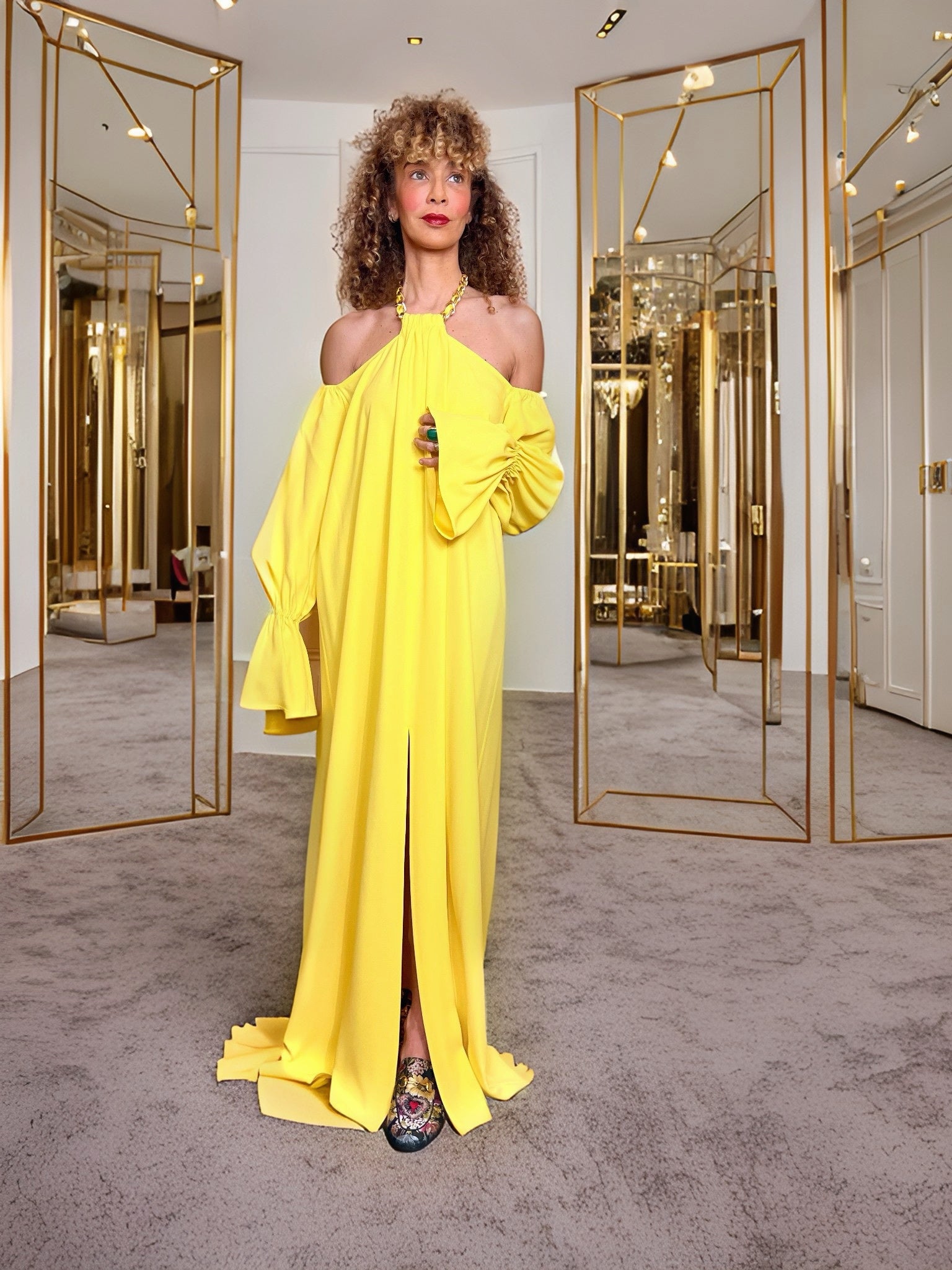 Un collier noué dans le dos soutient le drapé de la robe, formant une emmanchure américaine,