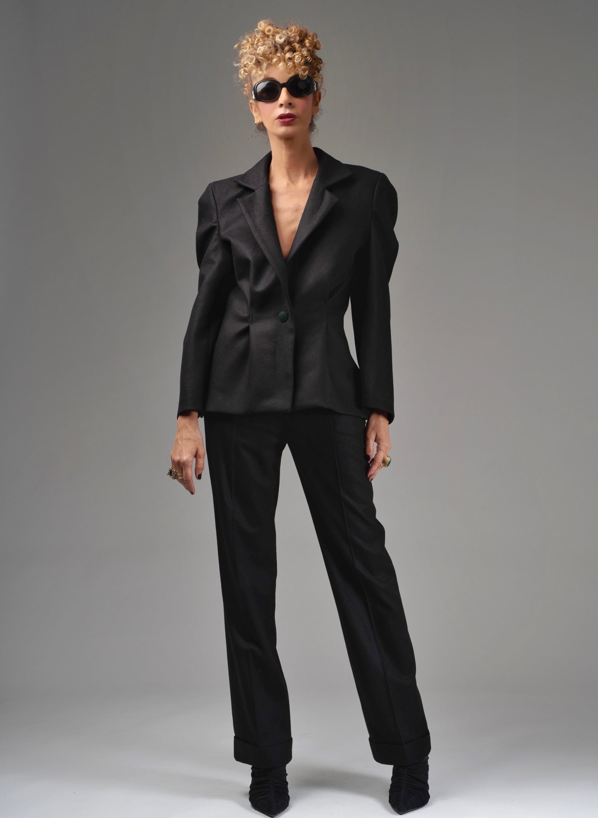 Veste architecturale 100% laine, 1 bouton recouvert, ouverture sur les côtés par boutons recouverts, possibilité de ceinturer pour fitter la taille